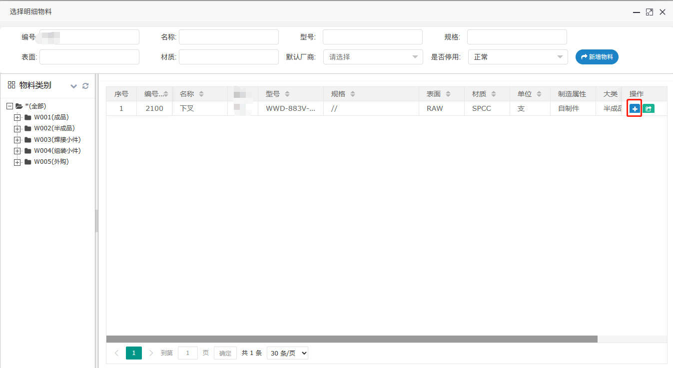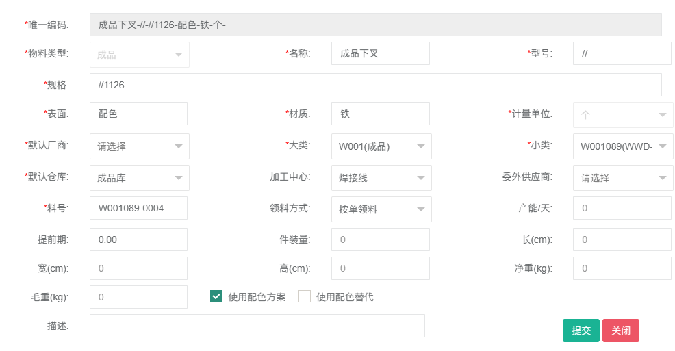 1、我们在物料主文件里新建一个成品物料(建议物料描述与半成品一致)。