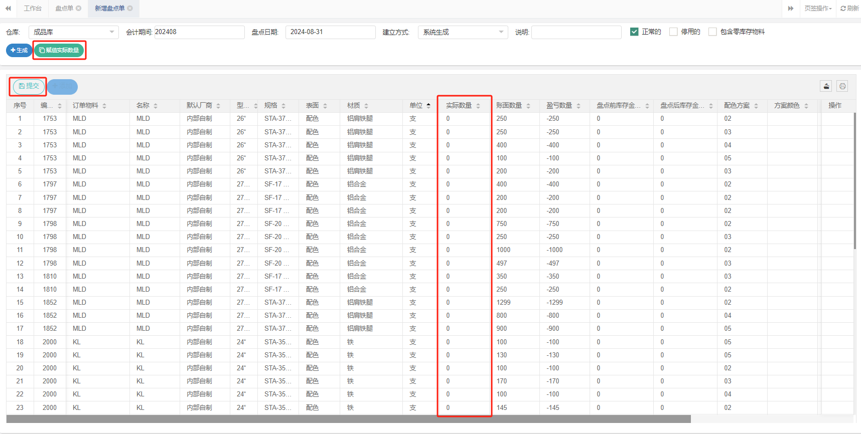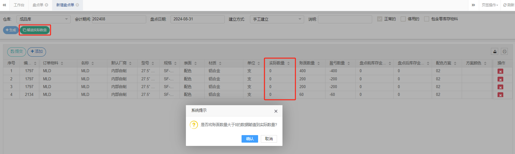 3.3 添加物料后,账面数量是物料库存数量,实际数量是盘点需要填入的数量。系统可以对实际数量自动填入,将账面数量自动加进来,减少录入量。点击赋值实际数量即可。