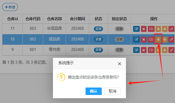 首先把需要盘点的仓库进行盘点锁定,点击第一个小锁图标。