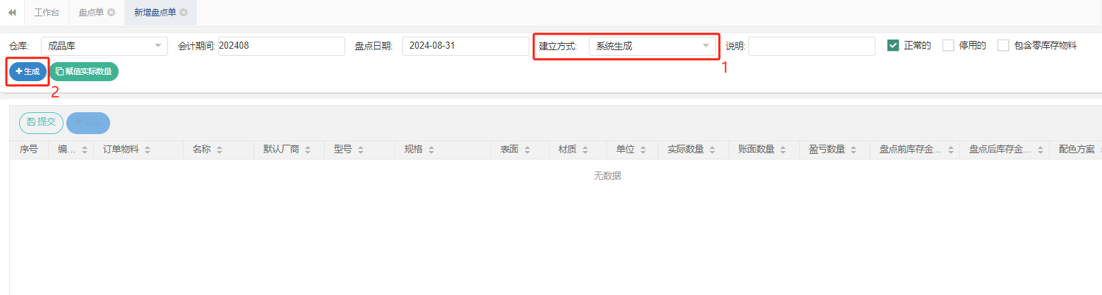 4.1 系统生成的盘点方法类似,区别是选择系统生成后点生成按钮,将仓库物料全部添加进来。
