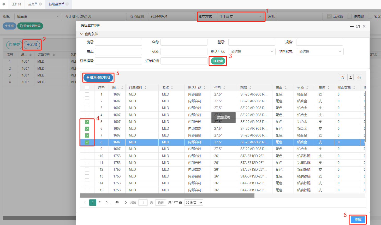 3.2 选择手工建立后,按照截图顺序操作,选择并添加需要盘点的物料。