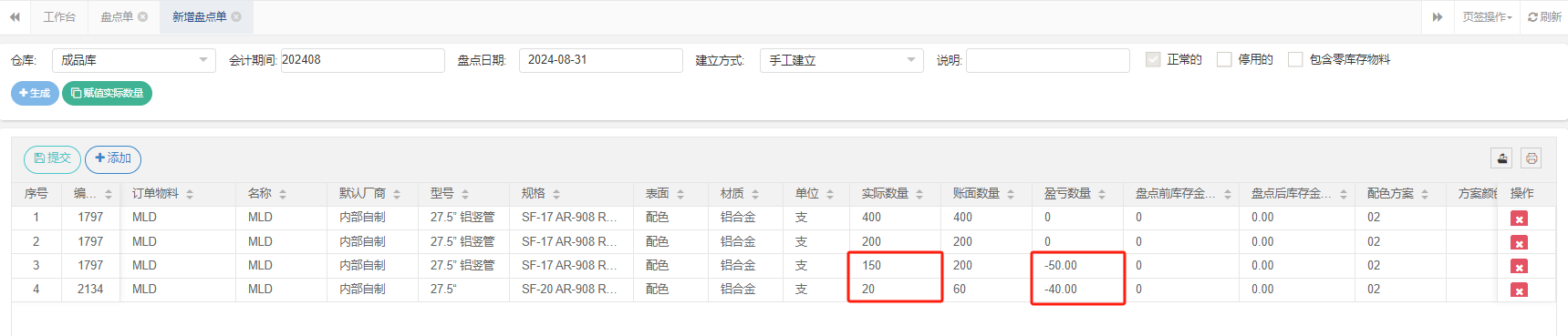 3.4 在实际数量填入数量后,后边显示对应盈亏数量。填写完毕后点击提交完成盘点。