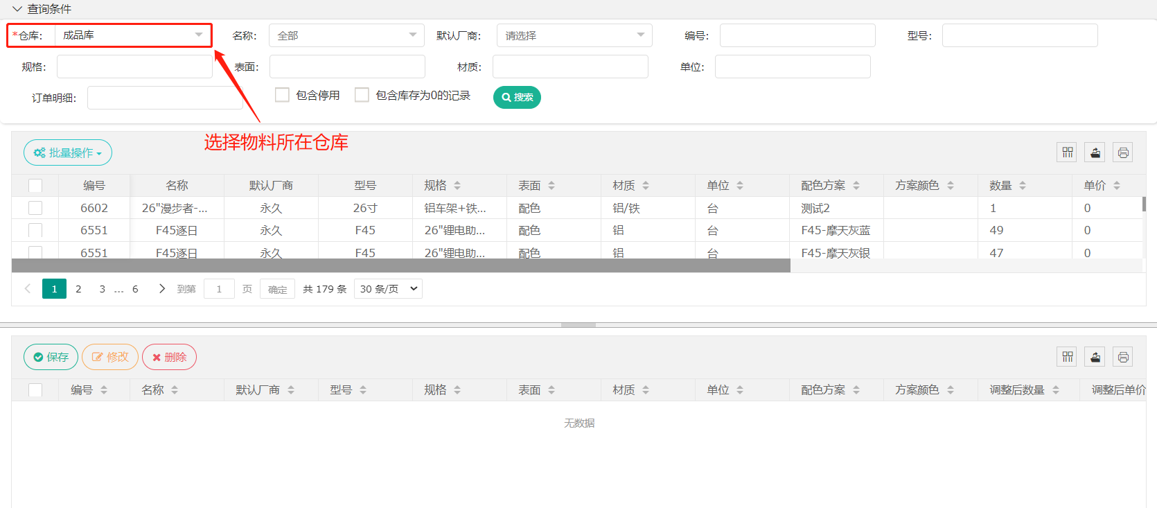 1、选择需要调账的仓库。其他条件皆为该仓库下物料的筛选条件。