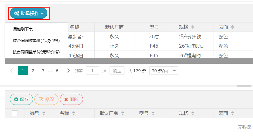 2、找到需要调账的物料,勾上复选框点击【批量操作】。其中调整结存单价支持快速获取合同价格进行调账,合同价格需要提前维护,包含含税价格和不含税价格两种类型。
