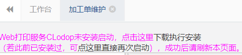 加工单打印条码报错,提示Web打印服务CLodop未安装启动,点击这里下载执行安装(若此前已安装过,可点这里直接再次启动),成功后请刷新本页面。