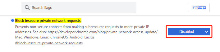 谷歌浏览器在地址栏输入,改为Disabled后重启浏览器。chrome://flags/#block-insecure-private-network-requests