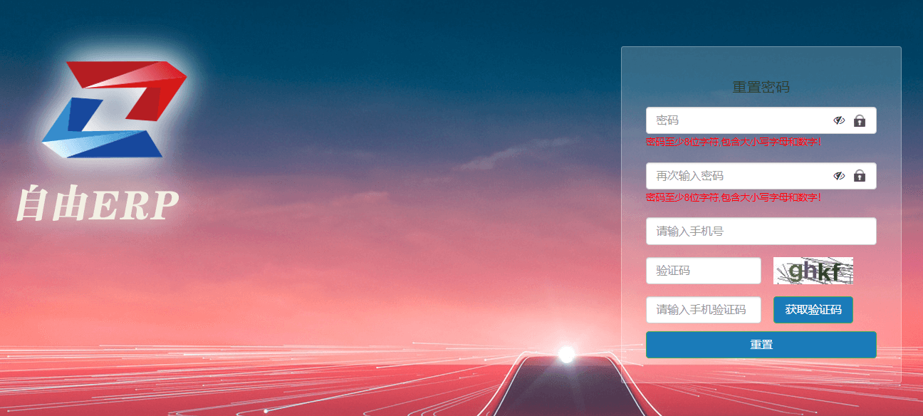 点击“忘记密码”字样,跳转到密码重置页面。输入新的密码两次,填入手机号和验证码,再获取短信验证码,提交后重置完毕。