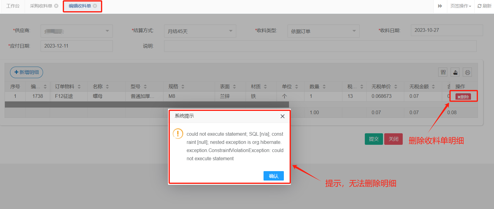 3、找到需要删除的物料入库撤销记录,进行删除。删除记录后即可正常删除收料单明细。