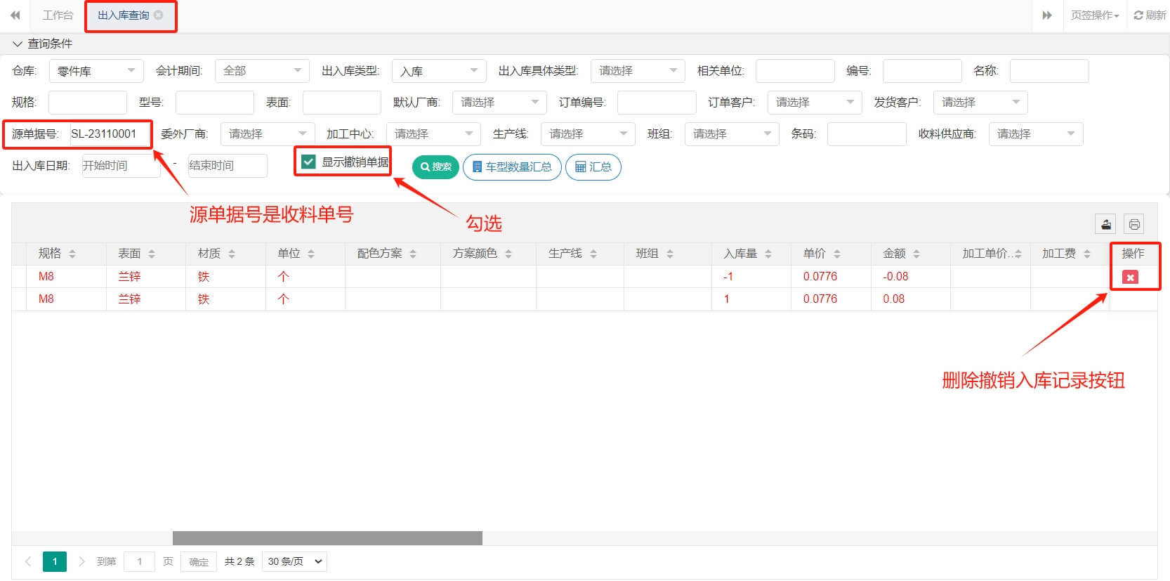 2、根据源单据号(收料单号)、物料编号搜索,并勾选“显示撤销单据”。