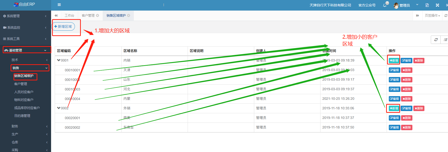 点击1是增加红色箭头的大的客户分类,点击2是在大的区域下边增加小的区域分类也就是绿色箭头指向的效果