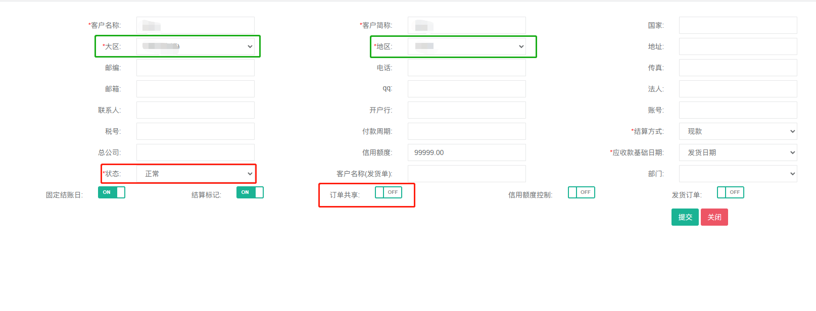 星号都是必填项,绿框里的选项就是我们第一部做的‘客户区域维护’;红色框的状态表示客户是否合作,如果不合作了可以将客户状态改为‘禁用’状态,当订单共享这个开关打开时,订单的产品入库时不会带着当时的销售订单号,而且订单的产品可以发给其他客户。当订单共享这个开关关闭时,订单的产品入库时会带着当时的销售订单号,发货时选择当时的订单号就会会直接出来。