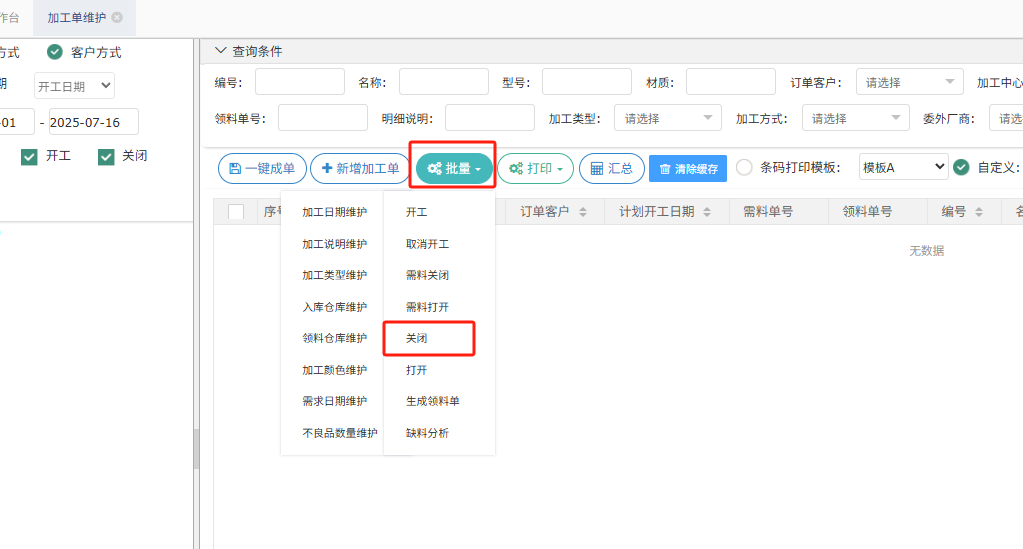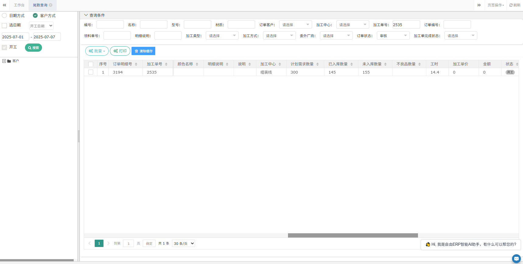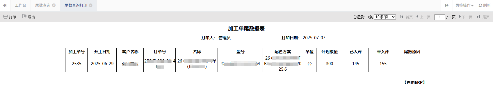 尾数查询功能查询的是生产加工未完成的加工单,即只部分入库并且开工的加工任务。该功能支持填写尾数原因(搁置原因),支持打印。