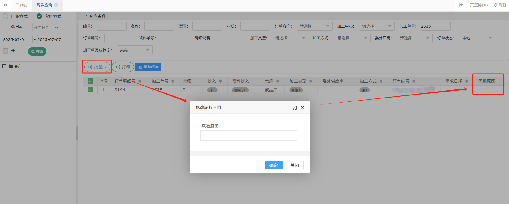 勾选需要维护原因备注的加工单,点击批量,选择尾数原因维护,在弹窗中填入内容即可。支持批量维护,勾选多条加工单再进行内容维护。