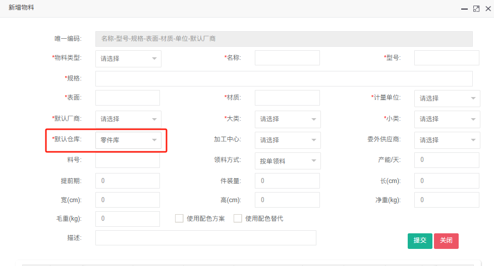 设置好仓库组之后,新增物料默认仓库选到零件库时,则该物料自动同步该仓库组下所有仓库的对应关系。减少工作人员设置“物料对应仓库”功能的工作量。